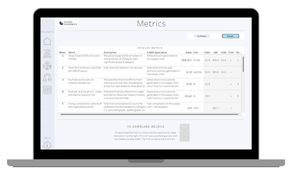 The S-MAP dashboard is bespoke to your company and customisable to your needs. It’s interactive, allowing you to explore the data, highlight key findings, compare different global scenarios, assess the trade-offs between different strategies, and present the metrics you need.