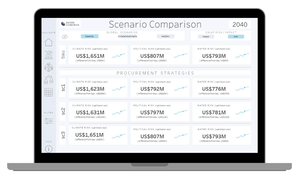 Conduct scenario analysis based on world-leading economic forecasting – not just ‘what ifs’ – considering how macroeconomic, climate and other global trends will affect you and how your business decisions will change your expected impact and risk profile over time.