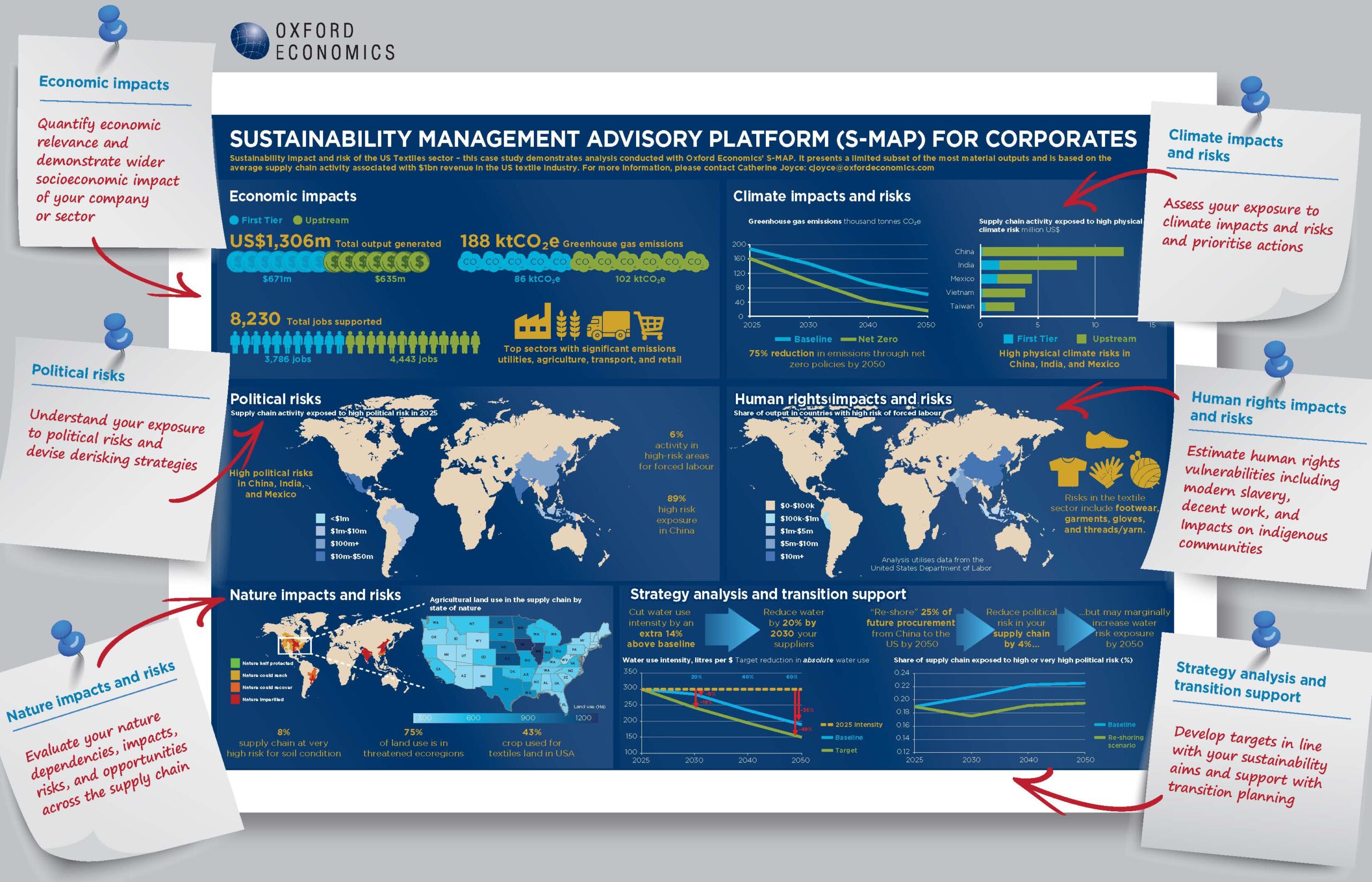 Oxford Economics’ Sustainable Advisory Management Platform (S-MAP) provides a holistic view of sustainability, integrating economic, environmental, and social risks and impacts. Using our economic expertise, models and tools, we help you assess these factors and develop effective strategies.