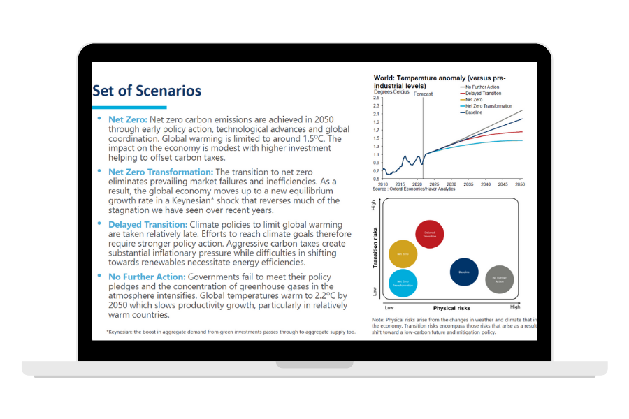 “我们希望使我们的气候假设和情景与中央银行在气候压力测试分析中使用的假设和情景更加一致,因此我们与牛津经济研究院合作,将其气候宏观模型应用到我们的生产率、国内生产总值和通货膨胀预测中。 牛津经济研究院一直都能及时回复我们的询问,并在其模型中就碳定价对宏观经济活动的影响提供了深刻的解释。我们对他们严谨的气候变化建模方法非常满意,很高兴能与他们合作。