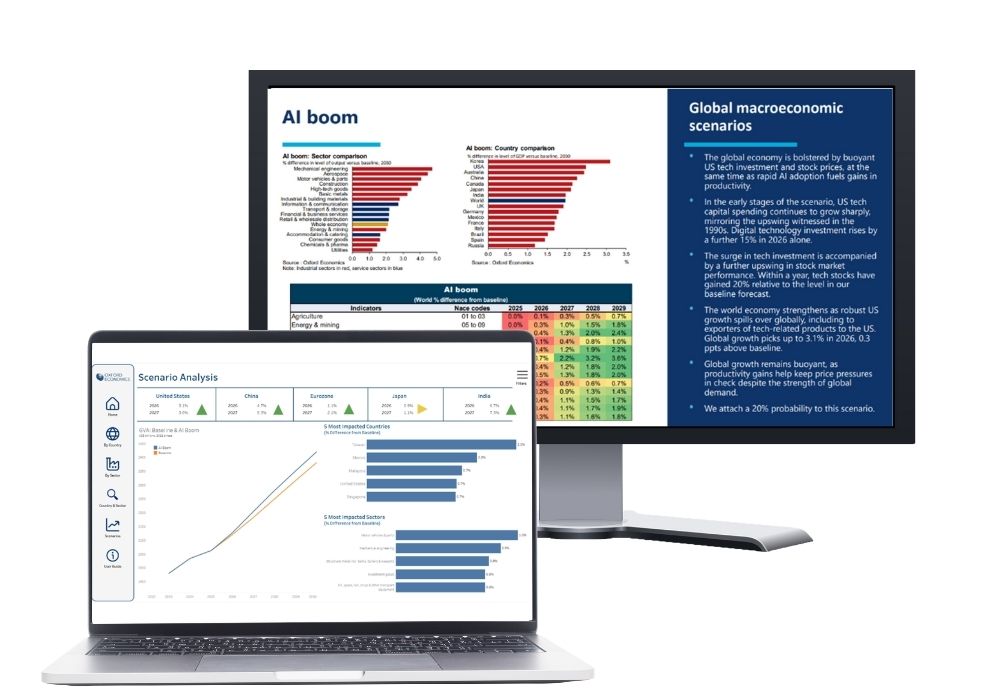 - 全球行业仪表盘: 对比不同国家与行业的增长前景,识别关键的上游与下游产业关系,并在多种情景假设下评估行业与市场所受到的影响,帮助您更清晰地洞察全球产业链结构与风险敞口。